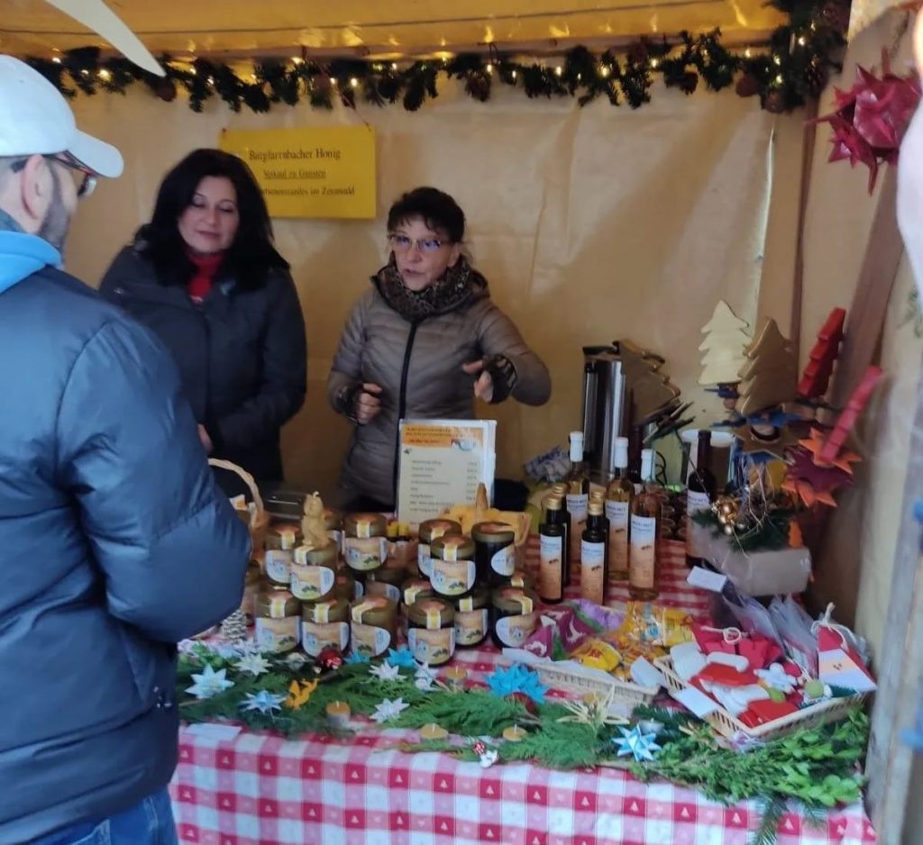 Der Stand am Burgfarrnbacher Weihnachtsmarkt, der immer am 3. Adventssonntag stattfindet, ist ein fester Bestandteil im Terminkalender unseres Imkervereins. Zur Freude der Vereinsmitglieder, die beim Auf- und Abbau mitgeholfen, sowie den Standdienst übernommen haben, war es in diesem Jahr deutlich wärmer als in den Vorjahren. Neben einem vielfältigen Angebot von Bienenwachskerzen, Met und Kosmetikprodukten aus Wachs haben wir im Wesentlichen Honig von unseren Vereinsbienen angeboten.