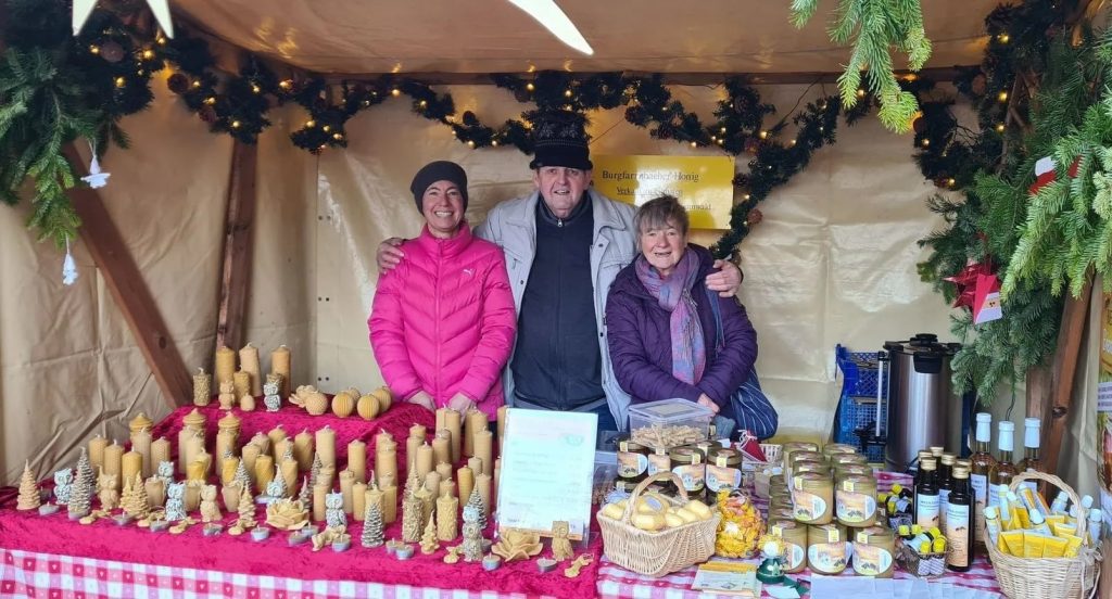 Aufgrund der Straßenbaumaßnahmen in Burgfarrnbach hat in diesem Jahr der Weihnachtsmarkt im Schlosshof stattgefunden. Unser heißer Met, Honig, Kerzen aus reinem Bienenwachs und weitere Produkte rund um die Imkerei, haben reißenden Absatz gefunden. Dank der fleißigen Helferinnen und Helfer, die den Stand aufgebaut, dekoriert, betreut und abgebaut haben, war dies ein erfolgreicher Tag für unseren Verein.